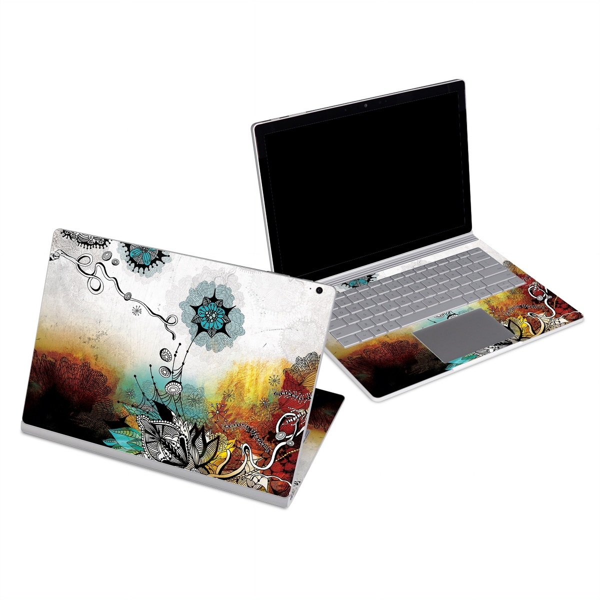 iStyles Microsoft Surface Book Series Skin design of Graphic design, Illustration, Art, Design, Visual arts, Floral design, Font, Graphics, Modern art, Painting, with black, gray, red, green, blue colors, and tagged with abstract, flowers.