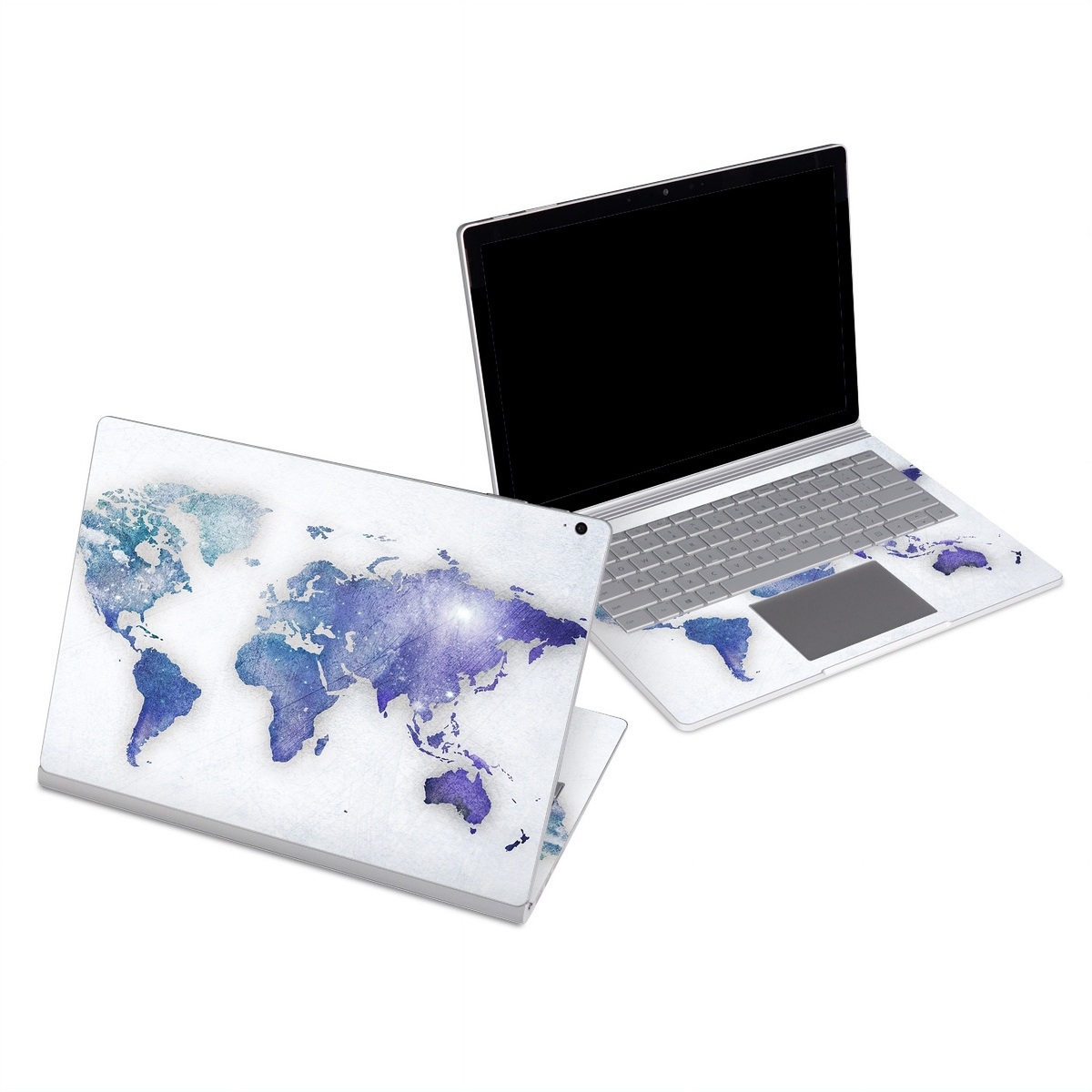 iStyles Microsoft Surface Book Series Skin design of World, Map, Watercolor paint, Illustration, with white, blue, purple colors, and tagged with maps, globe, map, pastel, travel, watercolor, world.