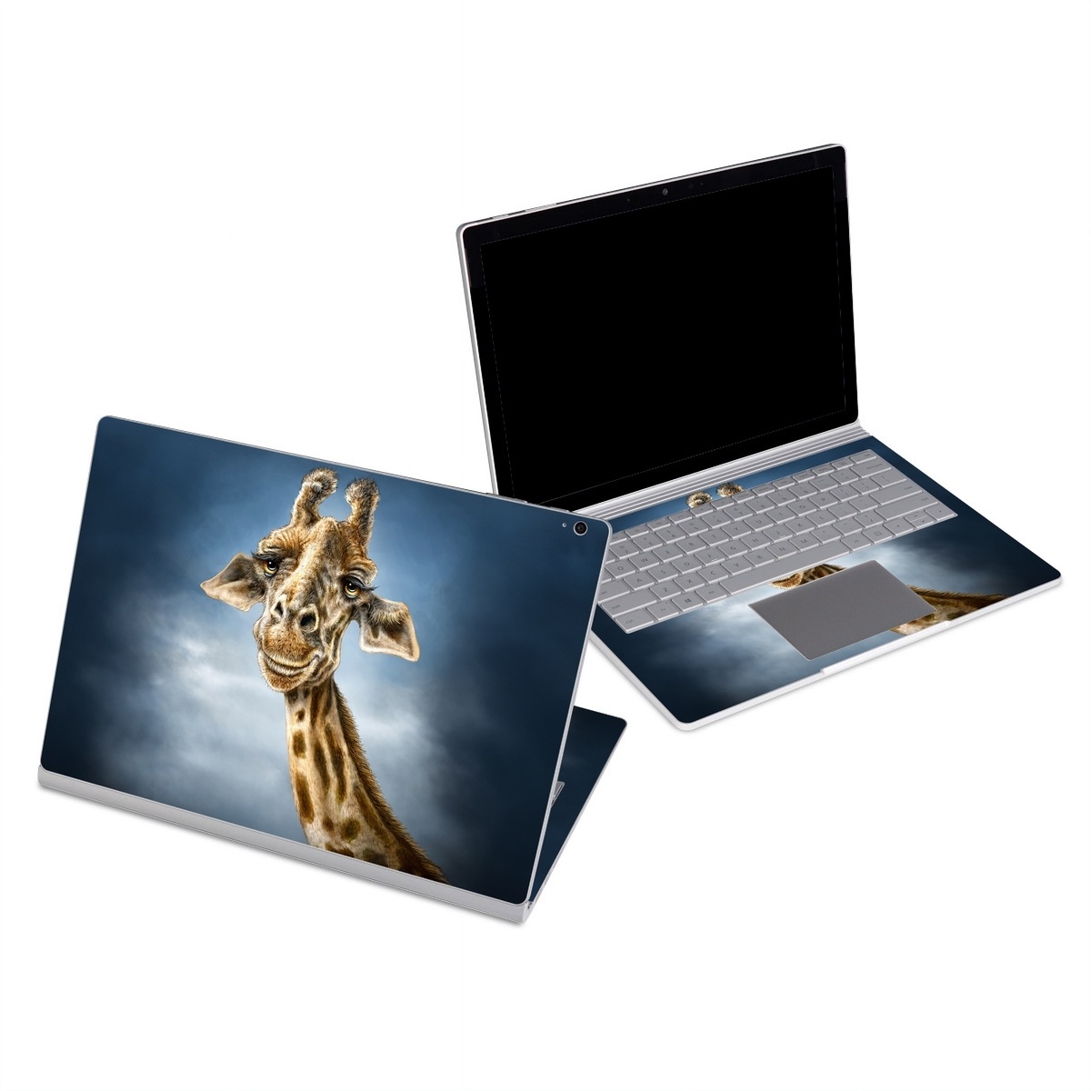iStyles Microsoft Surface Book Series Skin design of Giraffe, Giraffidae, Terrestrial animal, Wildlife, Head, Snout, Organism, Adaptation, Close-up, Neck, with gray, black, blue, green colors, and tagged with animals.