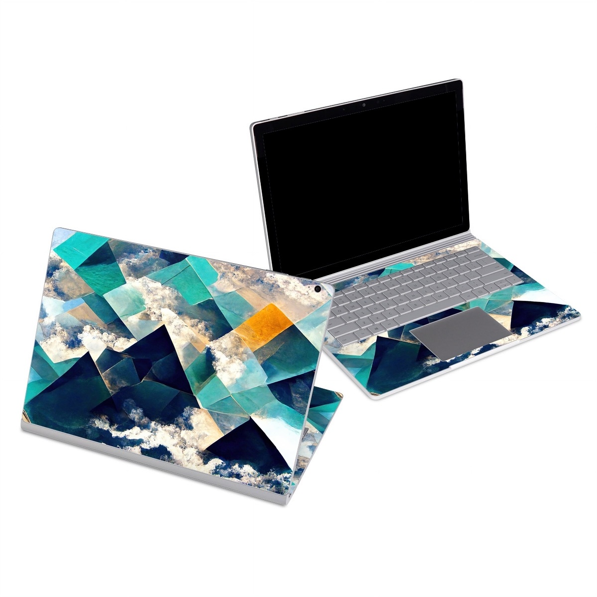 iStyles Microsoft Surface Book Series Skin design of Daytime, World, Nature, Blue, Azure, Green, Triangle, Rectangle, Architecture, Art, with blue, yellow, white, green colors, and tagged with abstract, nature, blue, clouds, geometric, gold, green, ocean, shapes, sky, water.