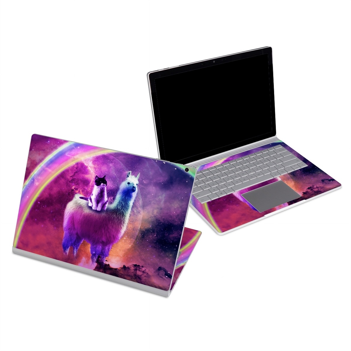 iStyles Microsoft Surface Book Series Skin design of Llama, Purple, Camelid, Alpaca, Sky, Livestock, Space, with purple, white, blue, pink, yellow, black colors, and tagged with space, animals, fantasy, animals, funny, galaxy, lasers, random, space, weird.