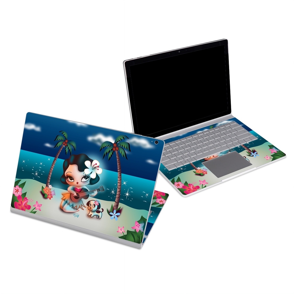 iStyles Microsoft Surface Book Series Skin design of Cartoon, Animated cartoon, Illustration, Animation, Fictional character, Plant, Art, Clip art, with blue, white, brown, pink, green, yellow, red colors, and tagged with animals, objects, flowers, nature, people, beach, cartoon, flower, flowers, hawaii, hawaiian, hula, ocean, pinup, pinupgirl, tropic, tropical.
