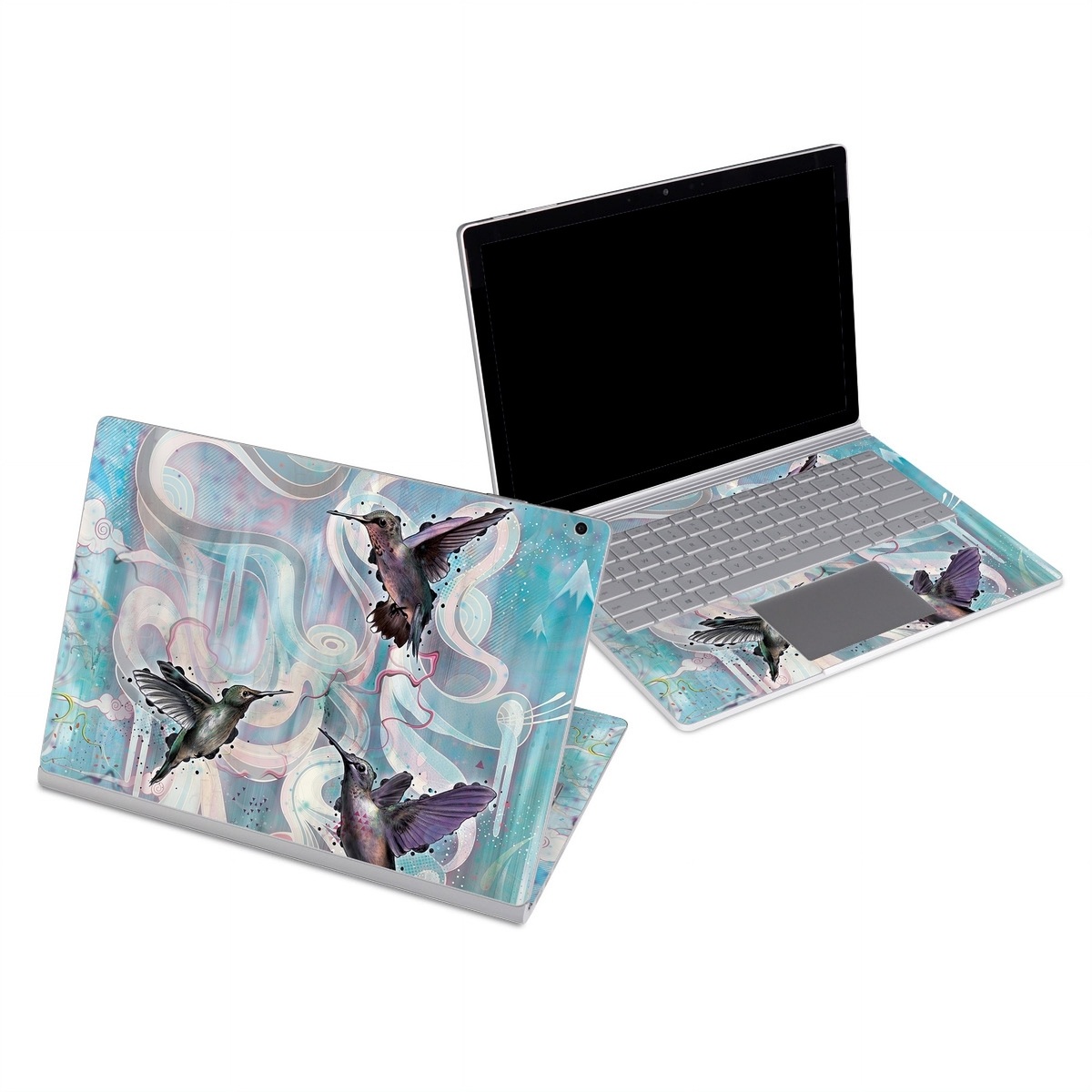iStyles Microsoft Surface Book Series Skin design of Bird, Watercolor paint, Illustration, Hummingbird, Painting, Art, Wing, Fictional character, Acrylic paint, Perching bird, with gray, blue, black colors, and tagged with animals, patterns.