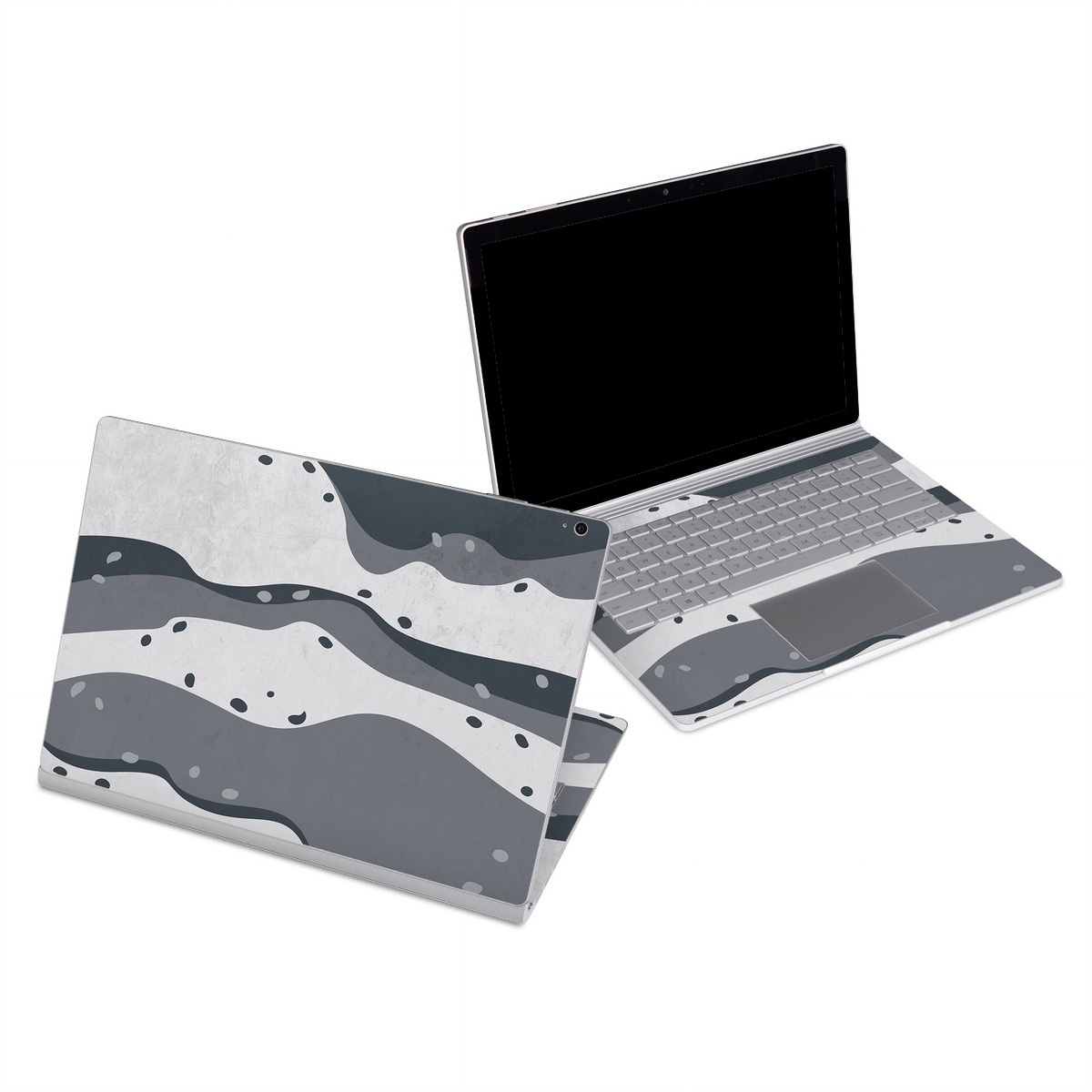 iStyles Microsoft Surface Book Series Skin design of White, Pattern, Water, Design, Illustration, Black-and-white, Metal, Drawing, Style, with black, white, gray colors, and tagged with patterns, military, camo, grey, steel.