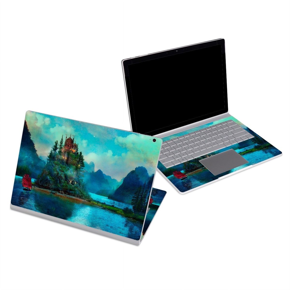 iStyles Microsoft Surface Book Series Skin design of Nature, Natural landscape, Sky, Painting, Landscape, Illustration, Watercolor paint, Art, Calm, Water castle, with black, gray, blue, green colors, and tagged with fineart, objects, fantasy, nature, urban.