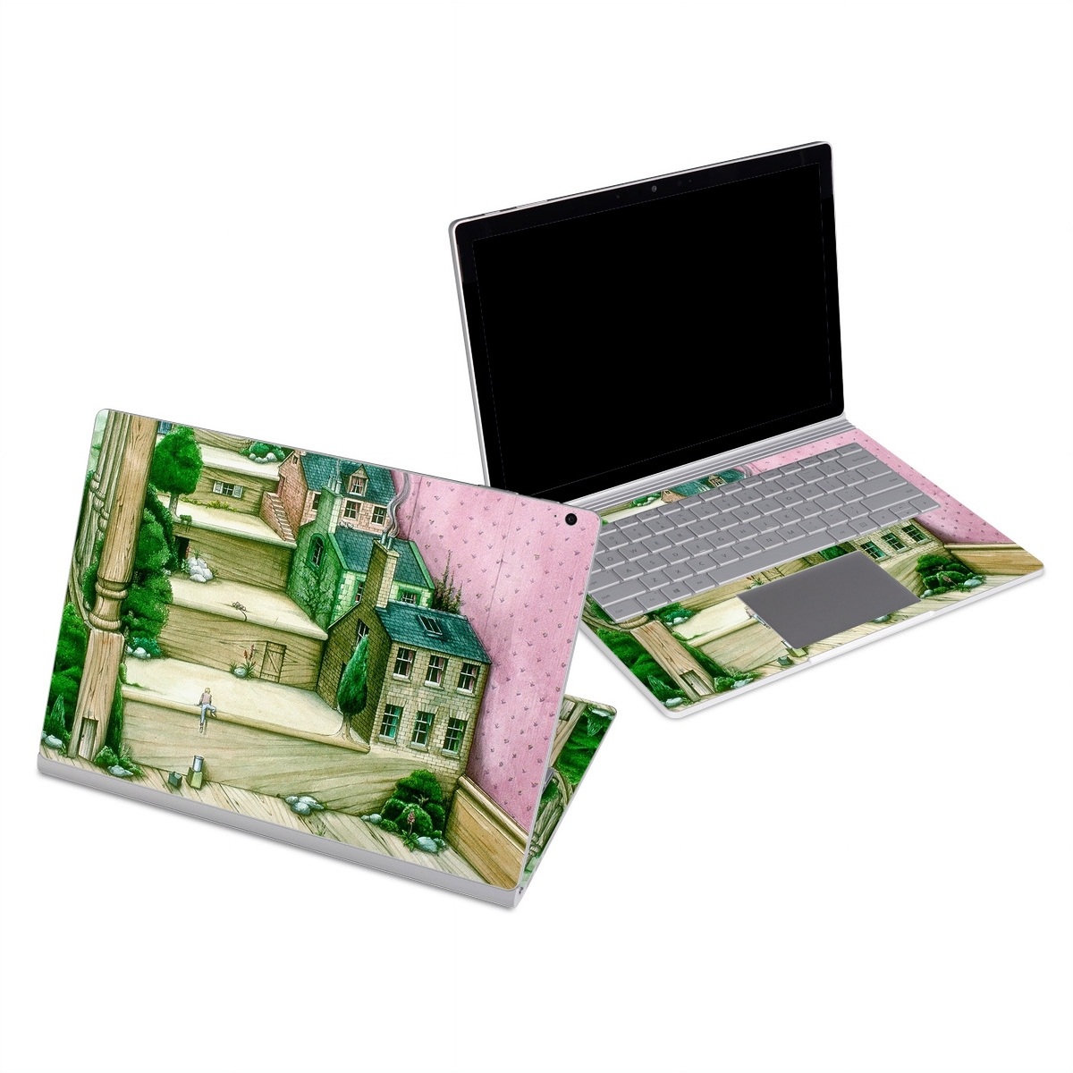 iStyles Microsoft Surface Book Series Skin design of Green, Stairs, House, Watercolor paint, Home, Illustration, Building, Wood, Plant, Sketch, with pink, green, brown colors, and tagged with objects, fineart, nature, urban, colinthompson, fineart, illustration, surreal.