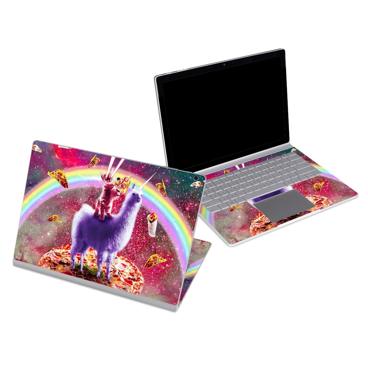 iStyles Microsoft Surface Book Series Skin design of Llama, Unicorn, Fictional character, Illustration, Graphic design, Livestock, Camelid, Mythical creature, Graphics, Art, with red, white, yellow, gray, purple, blue, green colors, and tagged with space, animals, fantasy, animals, funny, galaxy, lasers, random, space, weird.