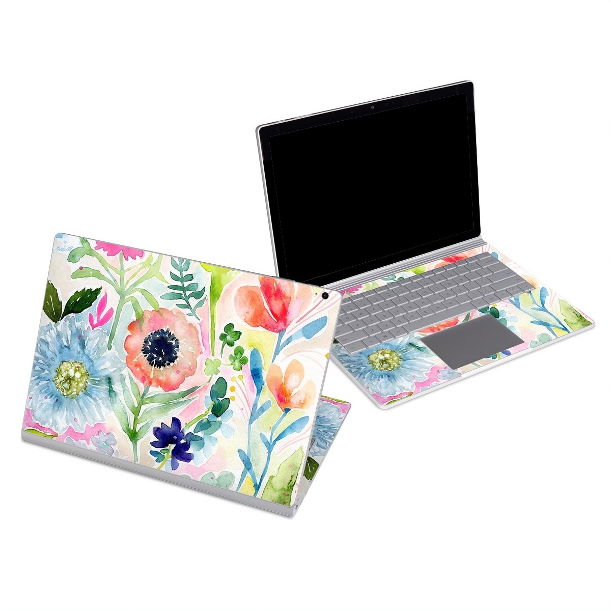 iStyles Microsoft Surface Book Series Skin design of Flower, Watercolor paint, Plant, Flowering plant, Pattern, Floral design, Botany, Petal, Wildflower, Design, with green, pink, yellow, orange, blue, red, purple colors, and tagged with flowers, patterns, floral, flowers, garden, paint, painting, watercolor.