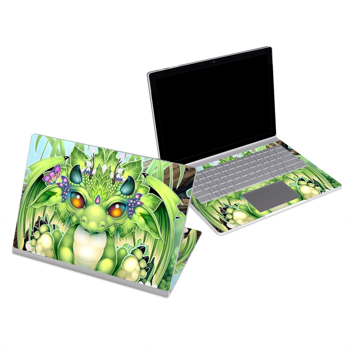 iStyles Microsoft Surface Book Series Skin design of Plant, Green, Leaf, Natural environment, Flower, Terrestrial plant, Grass, Creative arts, People in nature, Art, with green, white, yellow, brown, blue colors, and tagged with fantasy, animals, flowers, nature, dragon, wings, horns.