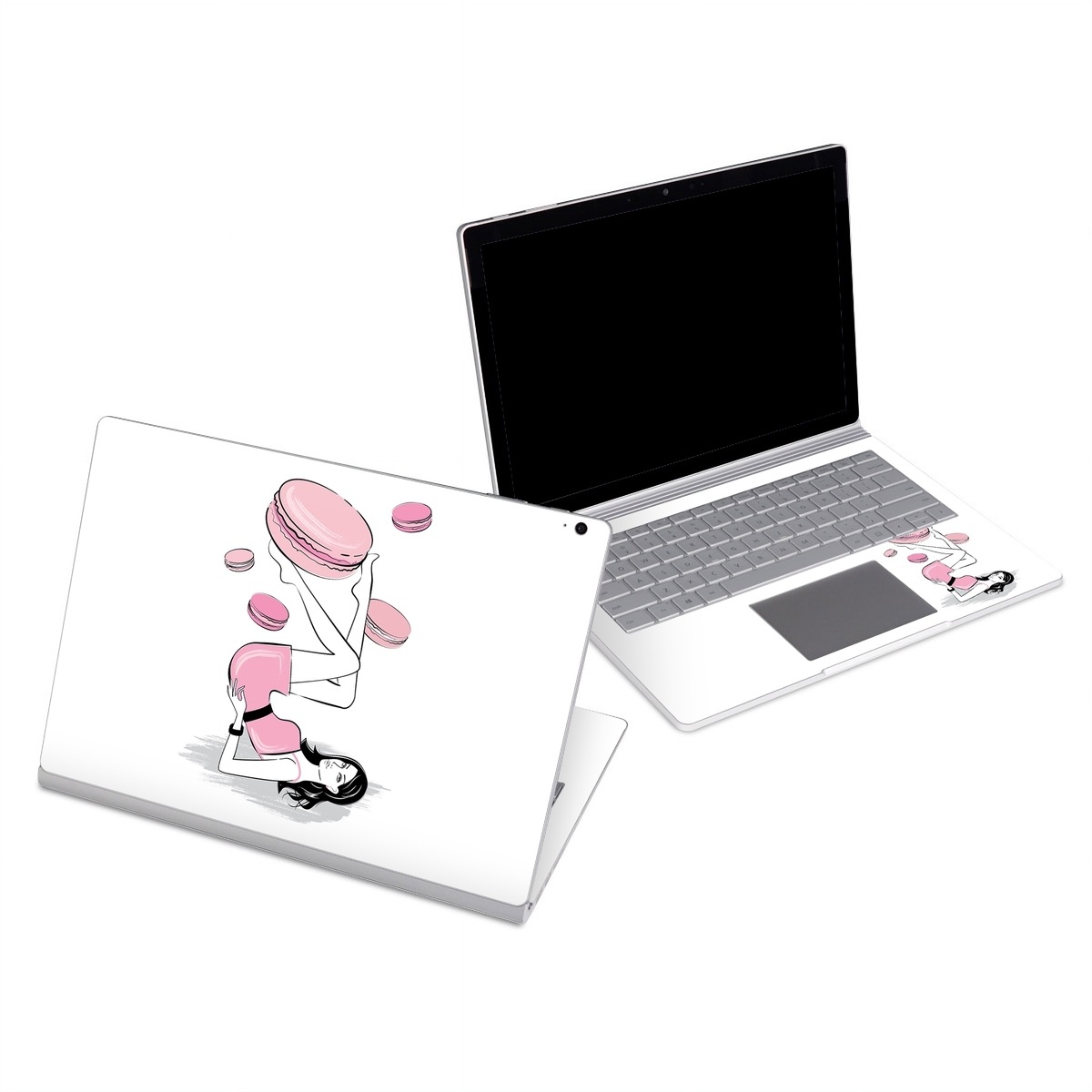 iStyles Microsoft Surface Book Series Skin design of Gesture, Pink, Cartoon, Happy, Art, Red, Font, Elbow, Magenta, Thumb, with white, black, pink, gray colors, and tagged with objects, people, girl, macaron, pink.