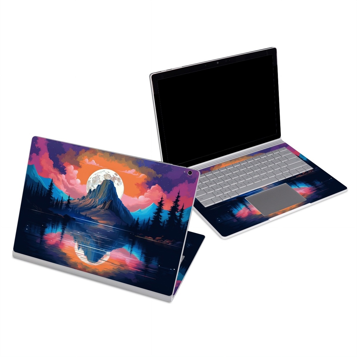 iStyles Microsoft Surface Book Series Skin design of Water, Sky, Cloud, Daytime, World, Mountain, Natural Landscape, Azure, Paint, Plant, Tree, with black, blue, red, yellow, orange, pink, purple colors, and tagged with nature, space, mountains, landscape, moon, clouds, lake, reflection.