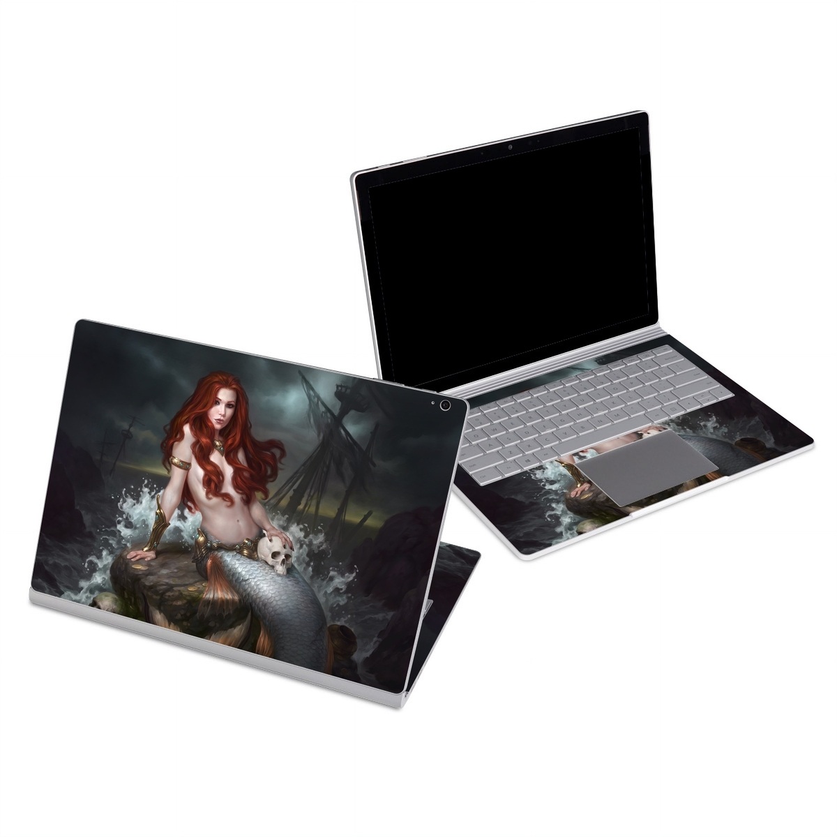 iStyles Microsoft Surface Book Series Skin design of Mermaid, Cg artwork, Illustration, Fictional character, Mythology, Mythical creature, Art, Long hair, Woman warrior, Sitting, with black, brown, red, yellow, white, gray colors, and tagged with fantasy, skulls, people, fantasy, mermaid, ocean, pirateships, ships, skull.