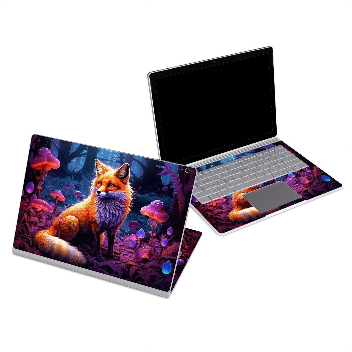 iStyles Microsoft Surface Book Series Skin design of Plant, Light, Carnivore, Orange, Organism, Tree, Pink, Natural landscape, Fawn, Whiskers, with red, orange, white, black, purple, gray, green colors, and tagged with animals, nature, fineart, fox, forest, mushrooms, trees, dusk, glow, bushy, tail.