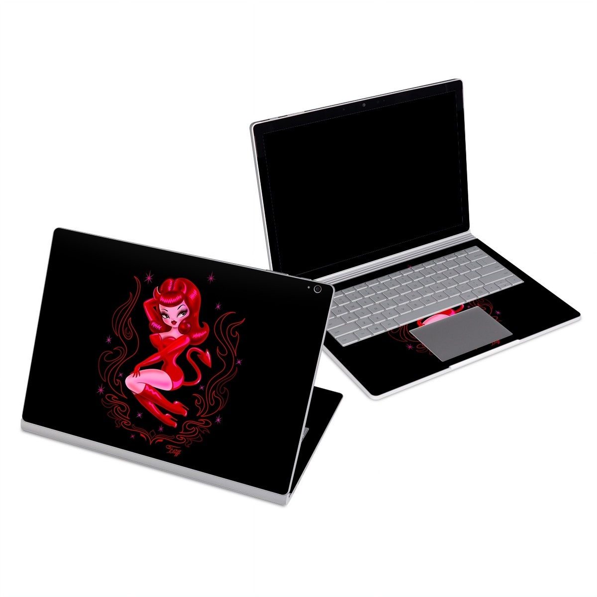 iStyles Microsoft Surface Book Series Skin design of Pink, Illustration, Fictional character, Graphic design, Neon, Magenta, Graphics, Art, with black, red, pink colors, and tagged with people, fantasy, devil, halloween, hotpink, pink, pinup, pinupgirl, red.