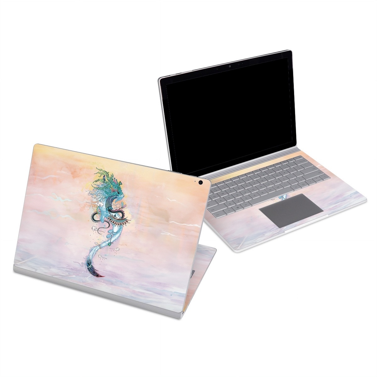 iStyles Microsoft Surface Book Series Skin design of Illustration, Water, Watercolor paint, Art, Fictional character, Graphic design, Mythology, Visual arts, Painting, Drawing, with yellow, pink, blue, green colors, and tagged with animals, abstract.