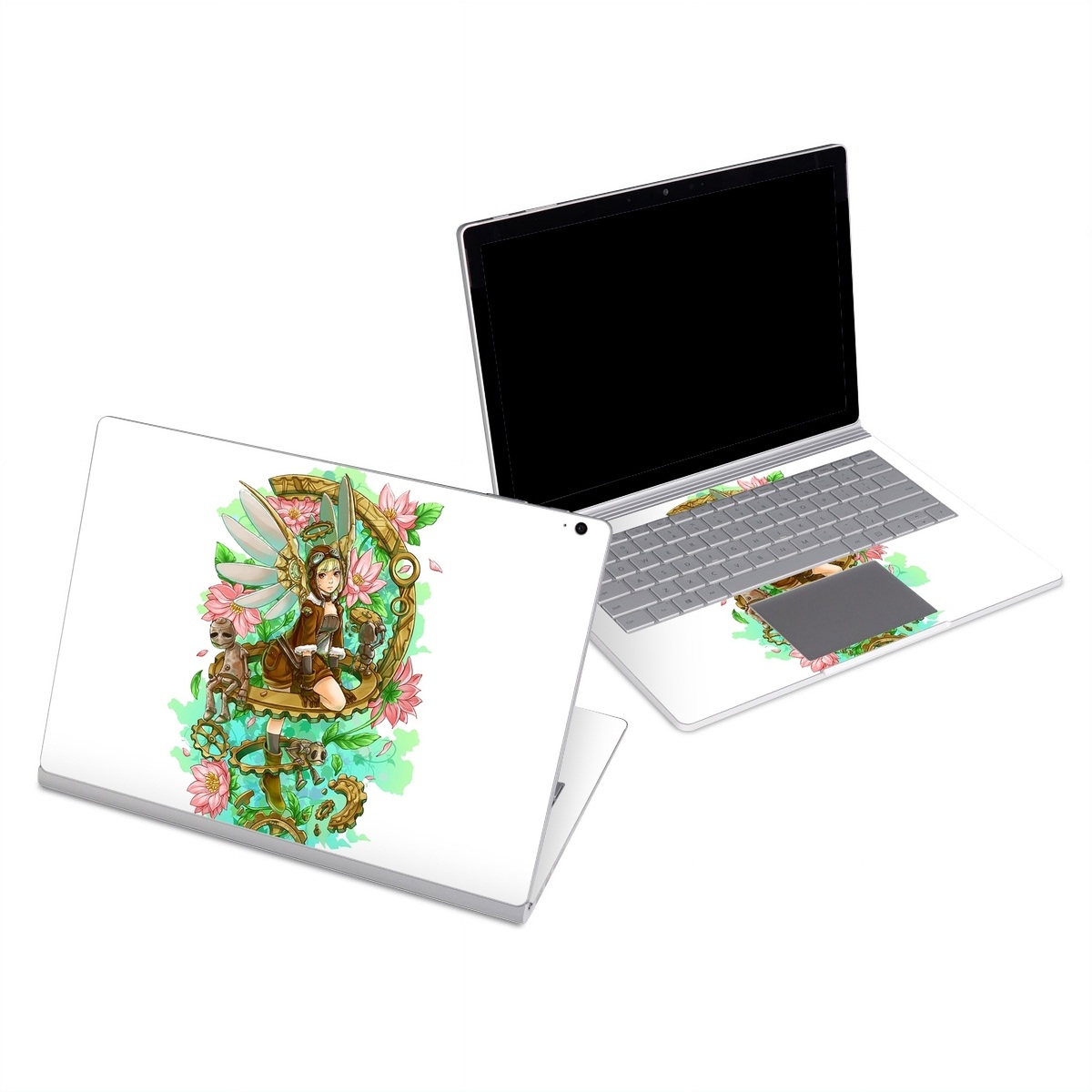 iStyles Microsoft Surface Book Series Skin design of Illustration, Fictional character, Clip art, Art, Graphics, Plant, with white, yellow, pink, green, brown, black colors, and tagged with people, fineart, fantasy, flowers, objects, angel, flowers, gear, gears, girl, pinup, pinupgirl, punk, steampunk, tinker.