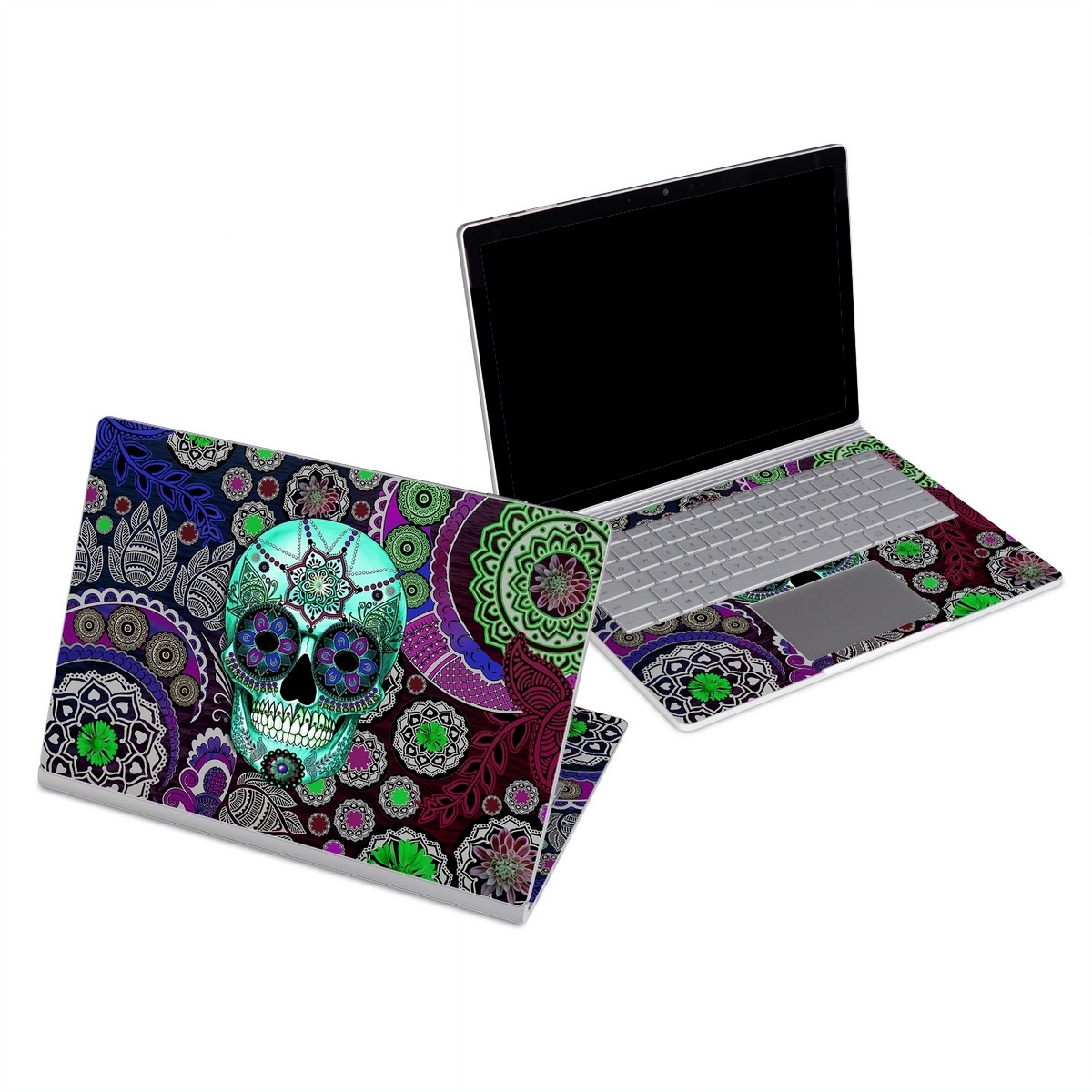 iStyles Microsoft Surface Book Series Skin design of Psychedelic art, Pattern, Skull, Purple, Bone, Violet, Design, Visual arts, Art, Magenta, with blue, green, purple, red, green, pink colors, and tagged with skulls, patterns, flowers.