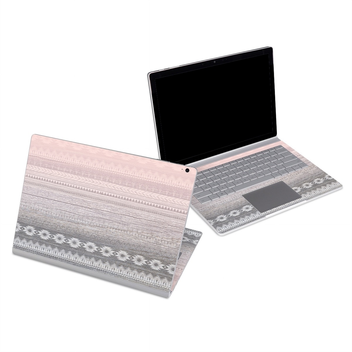 iStyles Microsoft Surface Book Series Skin design of White, Beige, Textile, Pattern, Lace, Tablecloth, Linen, Linens, with pink, white, gray colors, and tagged with patterns, nature, natural, nature, pattern, pink, tribal, wood.
