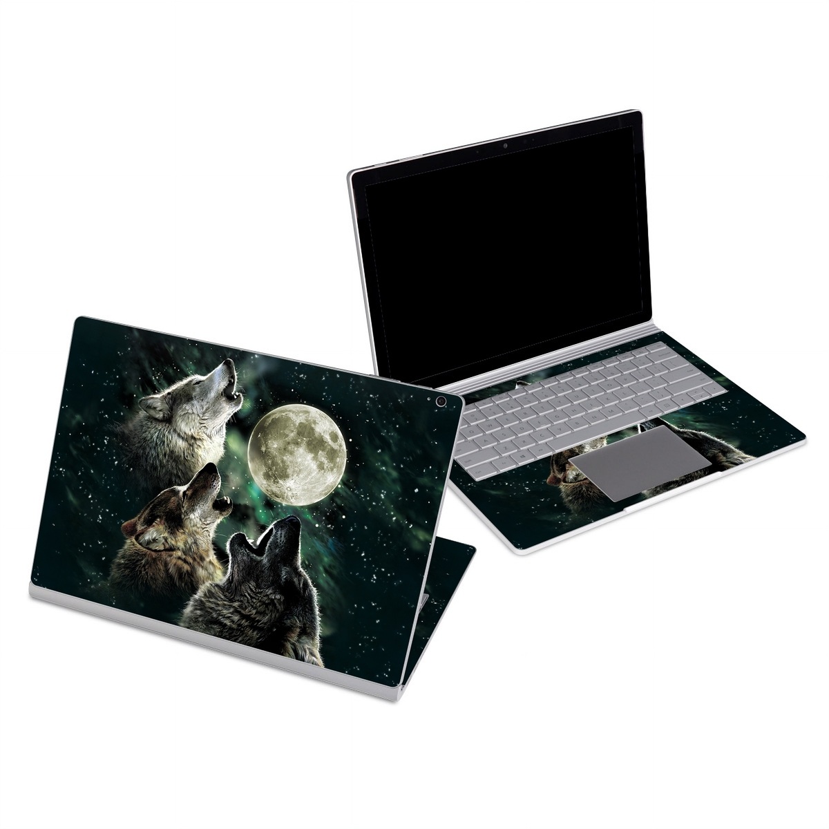 iStyles Microsoft Surface Book Series Skin design of Wolf, Light, Astronomical object, Moon, Wildlife, Organism, Moonlight, Sky, Atmosphere, Celestial event, with black, gray, green colors, and tagged with animals.