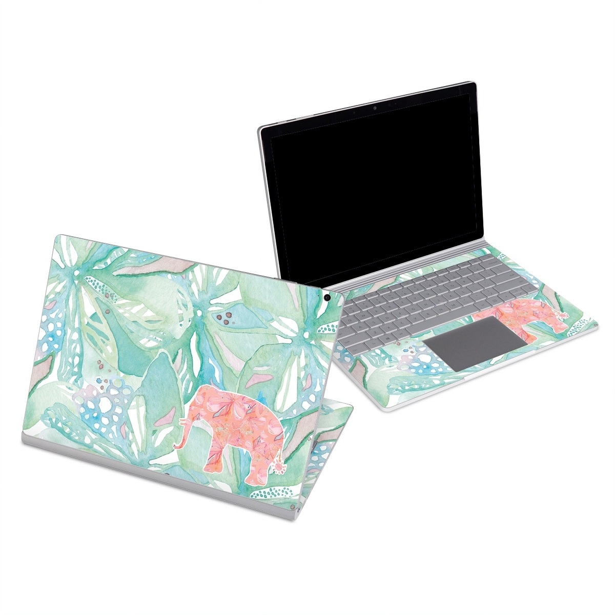 iStyles Microsoft Surface Book Series Skin design of Aqua, Turquoise, Pattern, Wrapping paper, Design, Illustration, Plant, Gift wrapping, Art, with blue, pink, white, green colors, and tagged with abstract, animals, flowers, animals, blue, bright, elephant, floral, flowers, pink, plants, tropical, watercolor.