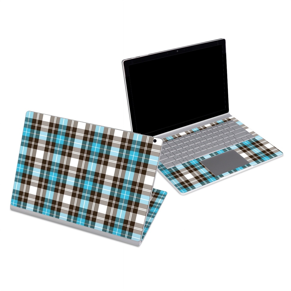 iStyles Microsoft Surface Book Series Skin design of Plaid, Pattern, Tartan, Turquoise, Textile, Design, Brown, Line, Tints and shades, with gray, black, blue, white colors, and tagged with patterns.