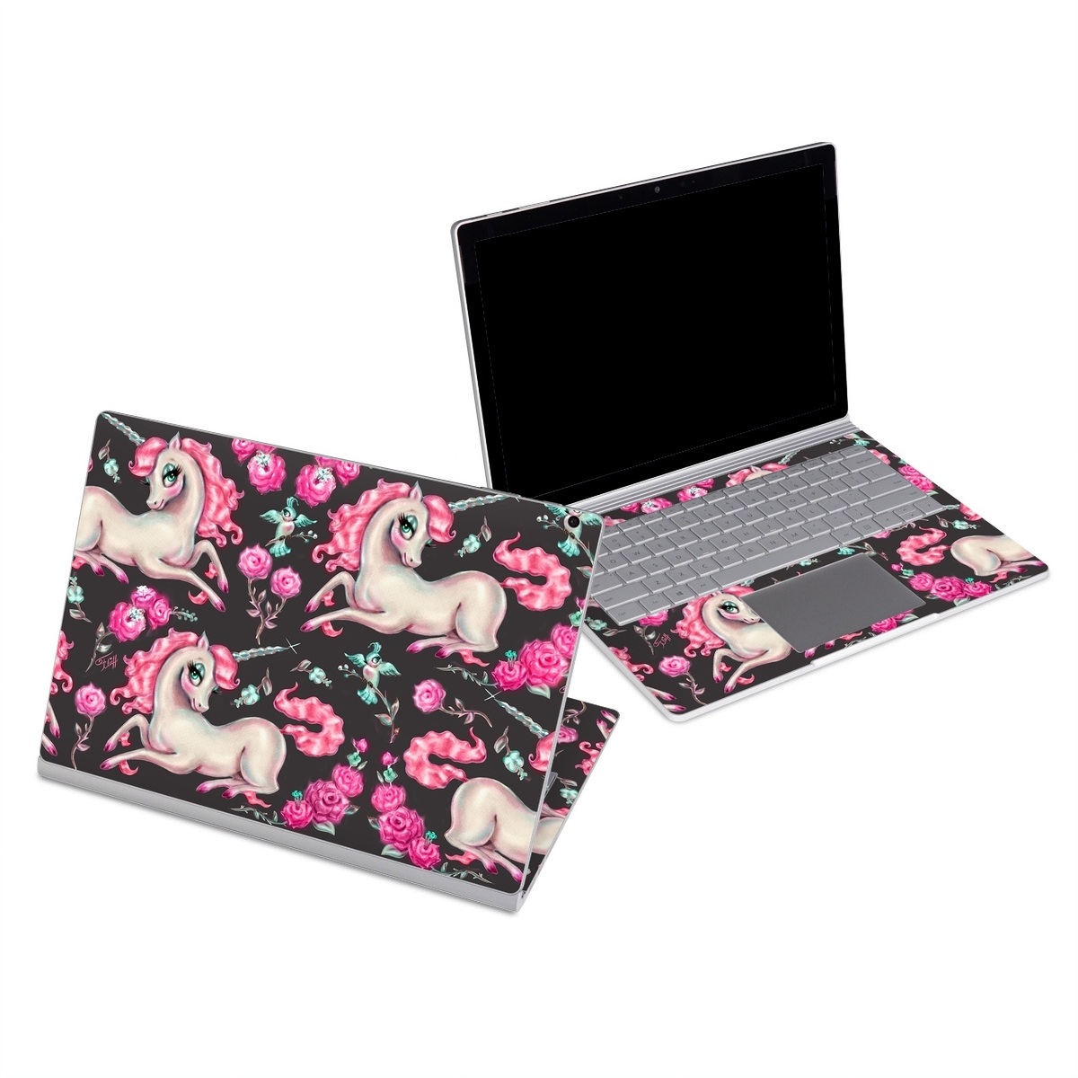 iStyles Microsoft Surface Book Series Skin design of Pink, Horse, Pony, Fictional character, Unicorn, Mythical creature, Mane, Textile, Animal figure, Illustration, with white, pink, blue, black, red colors, and tagged with patterns, animals, flowers, fantasy, flower, flowers, magic, magical, pink, rose, roses, unicorn, unicorns.