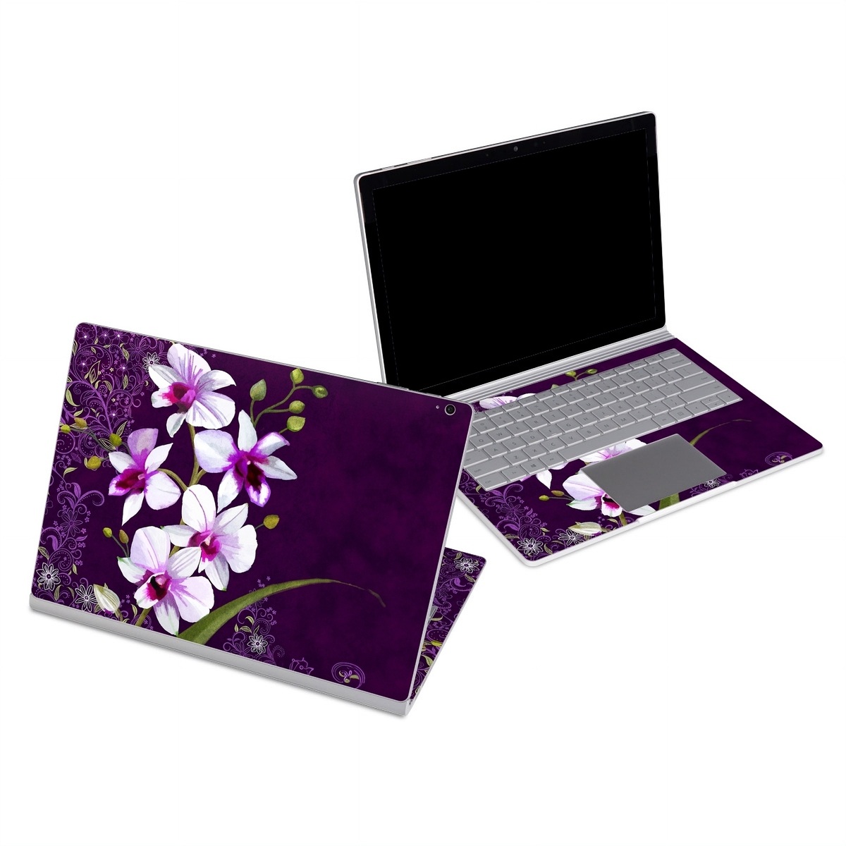 iStyles Microsoft Surface Book Series Skin design of Flower, Purple, Petal, Violet, Lilac, Plant, Flowering plant, cooktown orchid, Botany, Wildflower, with black, gray, white, purple, pink colors, and tagged with flowers, abstract.