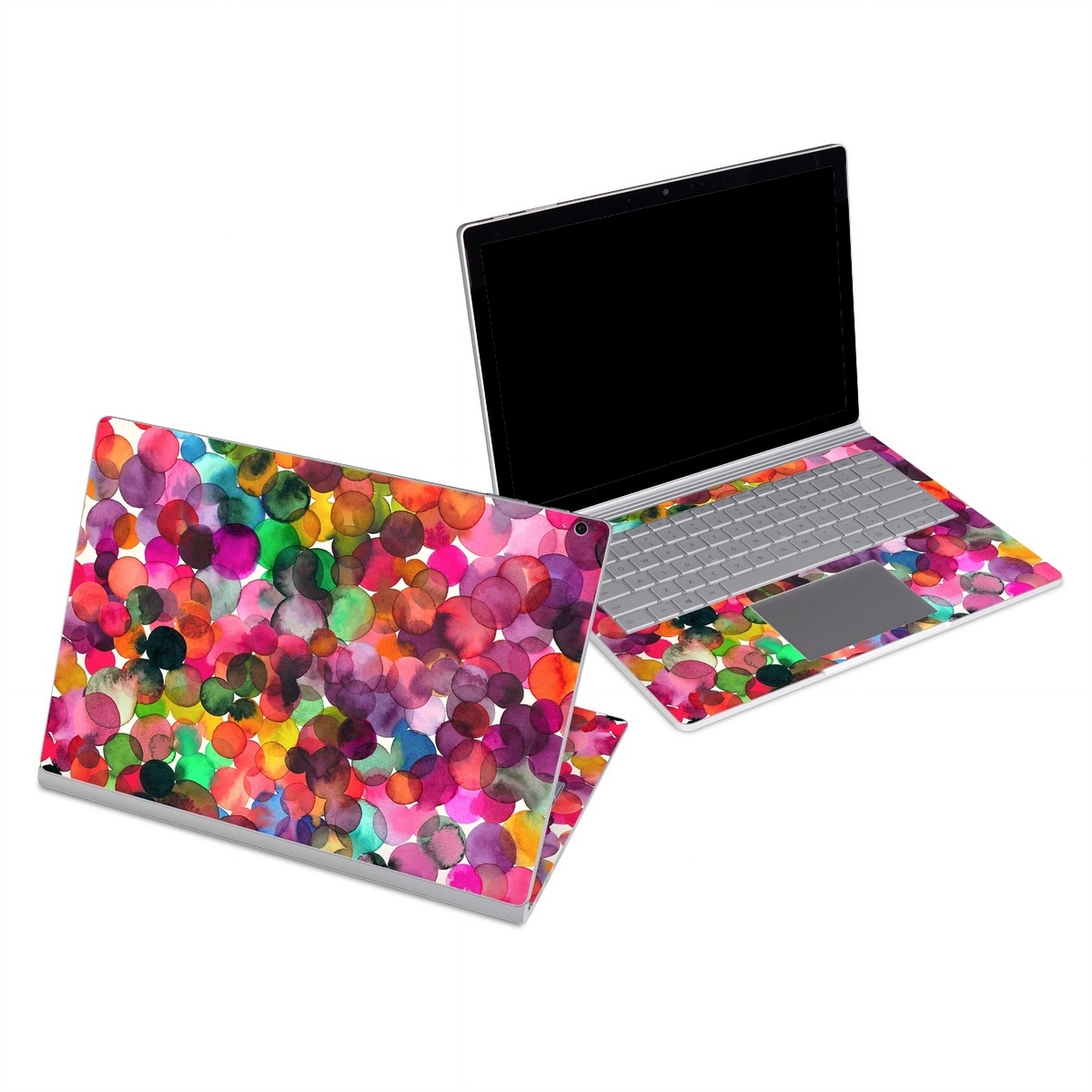 iStyles Microsoft Surface Book Series Skin design of Colorfulness, Fashion accessory, with red, white, pink, purple, blue, green, black, yellow, orange colors, and tagged with patterns, abstract, bright, colorful, dots, drops, vivid, watercolor.