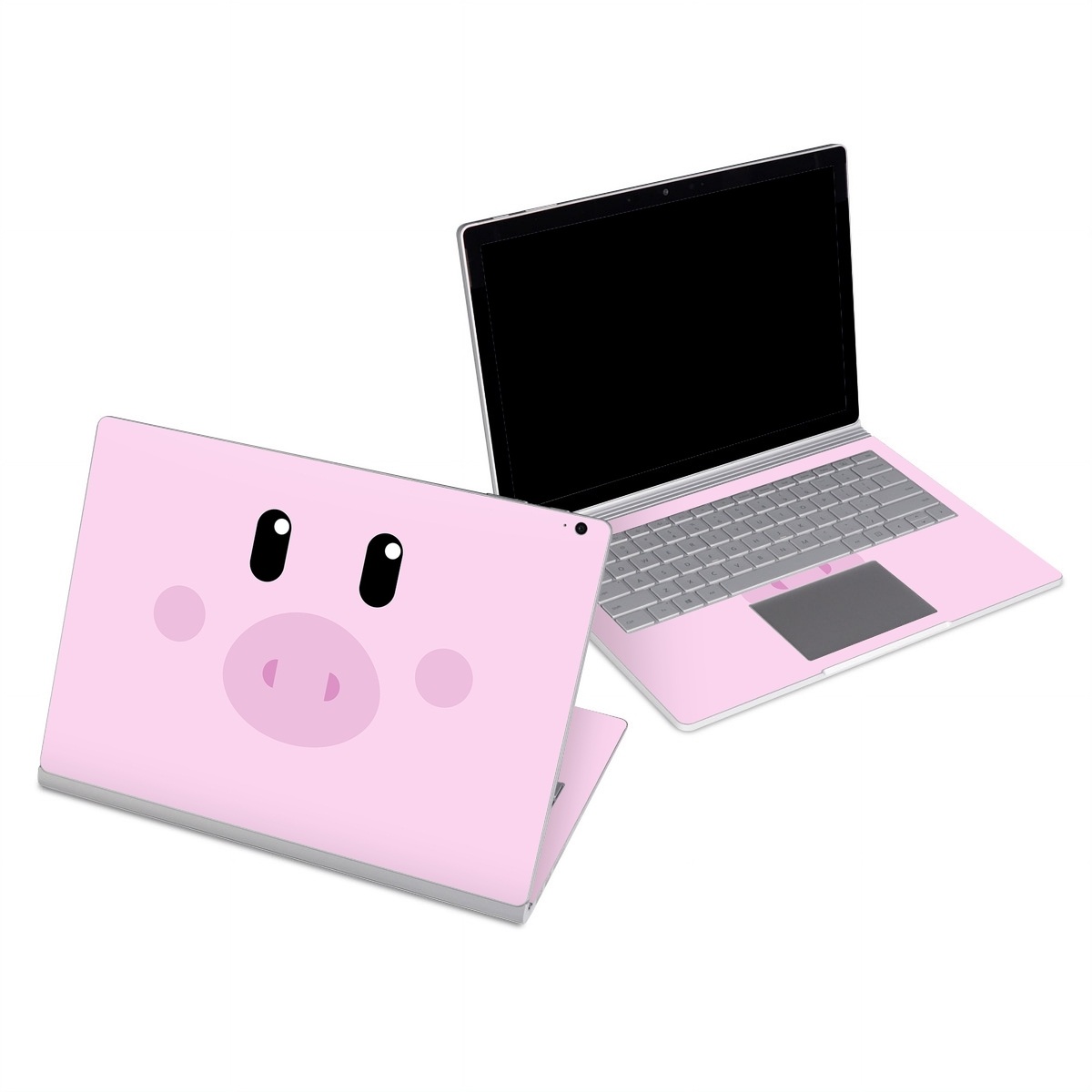 iStyles Microsoft Surface Book Series Skin design of Pink, Cartoon, Violet, Nose, Purple, Snout, Suidae, Material property, Illustration, Animation, with pink, black, white colors, and tagged with animals, animals, cute, faces, farm, simple.