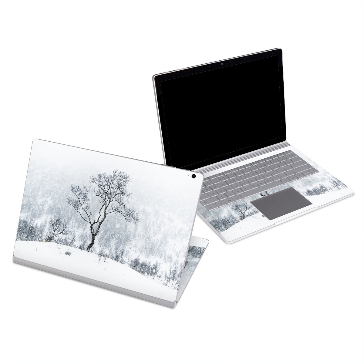 iStyles Microsoft Surface Book Series Skin design of Snow, Winter, Tree, Nature, White, Sky, Atmospheric phenomenon, Natural landscape, Freezing, Blizzard, with white, gray, black colors, and tagged with nature, photos, forest, landscape, mountains, outdoors, snow, trees, winter.
