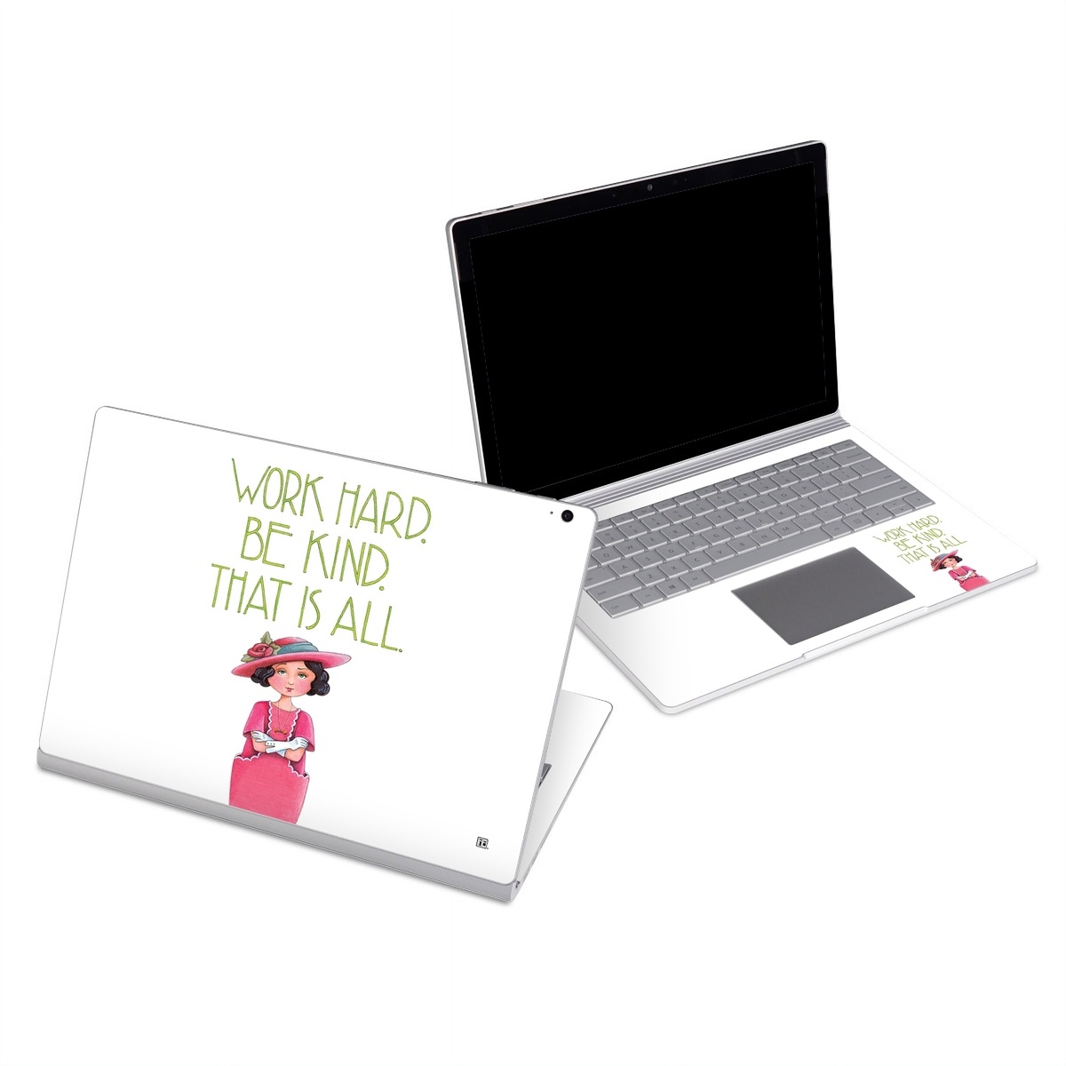 iStyles Microsoft Surface Book Series Skin design of Pink, Headgear, Font, Hat, with white, green, pink, black, white, yellow, blue colors, and tagged with signs, flowers, people, objects, cartoon, classy, draw, drawing, girl, green, lady, pink, woman, kind.