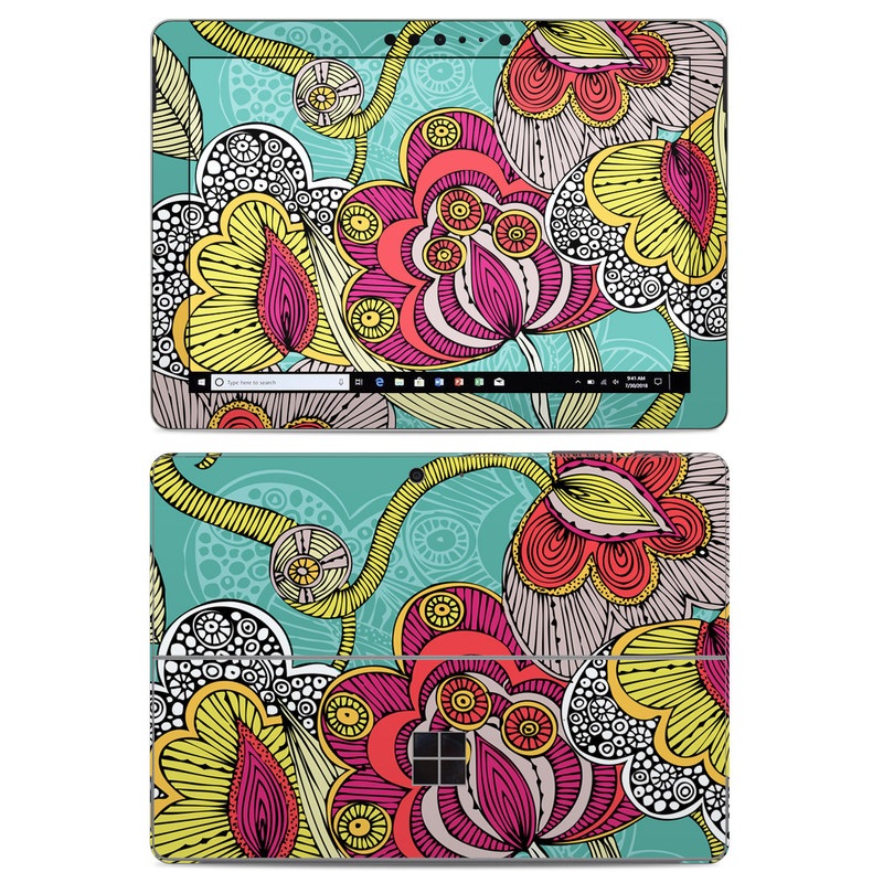 iStyles Microsoft Surface Go Skin design of Pattern, Visual arts, Motif, Floral design, Design, Art, Plant, Flower, Organism, Textile, with red, yellow, blue, gray, pink colors, and tagged with flowers.