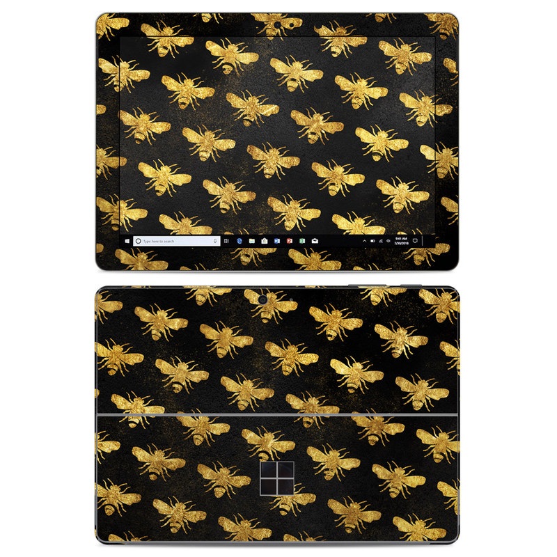 iStyles Microsoft Surface Go Skin design of Pattern, Yellow, Flower, Design, Plant, Wildflower, Textile, Metal, with black, yellow colors, and tagged with patterns, animals, bee, bees, bugs, fashion, gold, insect.