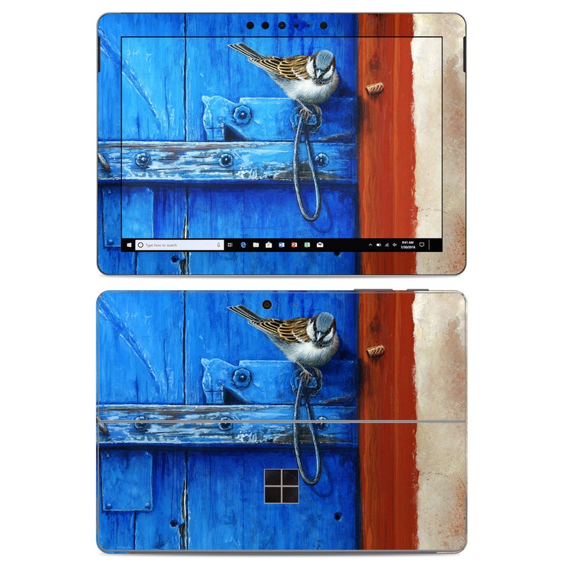 iStyles Microsoft Surface Go Skin design of Blue, Wood, Door handle, Door, Wall, Door knocker, Electric blue, Still life photography, Window, Handle, with red, blue, brown colors, and tagged with animals, fineart, animal, bird, birds, fineart, outdoors.