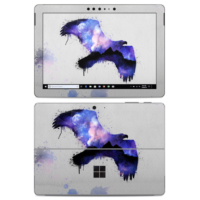 iStyles Microsoft Surface Go Skin design of Blue, Watercolor paint, Purple, Water, Graphic design, Illustration, Art, Ink, Painting, Electric blue, with gray, white, blue, black, purple colors, and tagged with animals, nature, space, animals, bird, eagle, falcon, hawk, moon, nature, night, stars, watercolor.