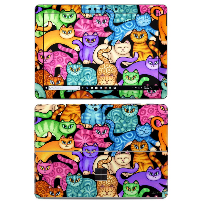 iStyles Microsoft Surface Go Skin design of Cat, Cartoon, Felidae, Organism, Small to medium-sized cats, Illustration, Animated cartoon, Wildlife, Kitten, Art, with black, blue, red, purple, green, brown colors, and tagged with patterns, animals.