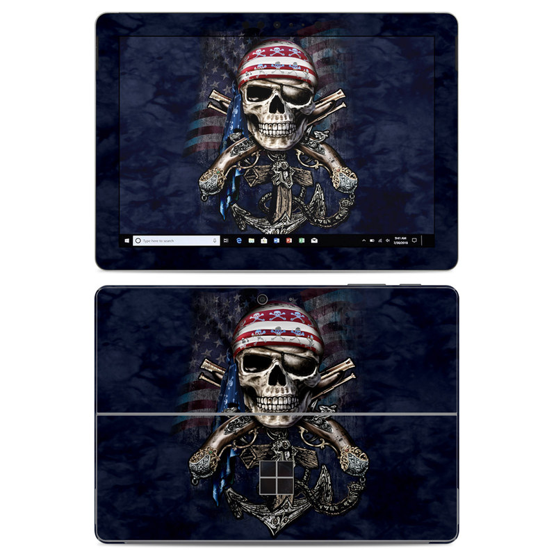 iStyles Microsoft Surface Go Skin design of Skull, Bone, Skeleton, Illustration, Outerwear, T-shirt, Flag, Art, with black, gray, red colors, and tagged with skulls, flags, objects.