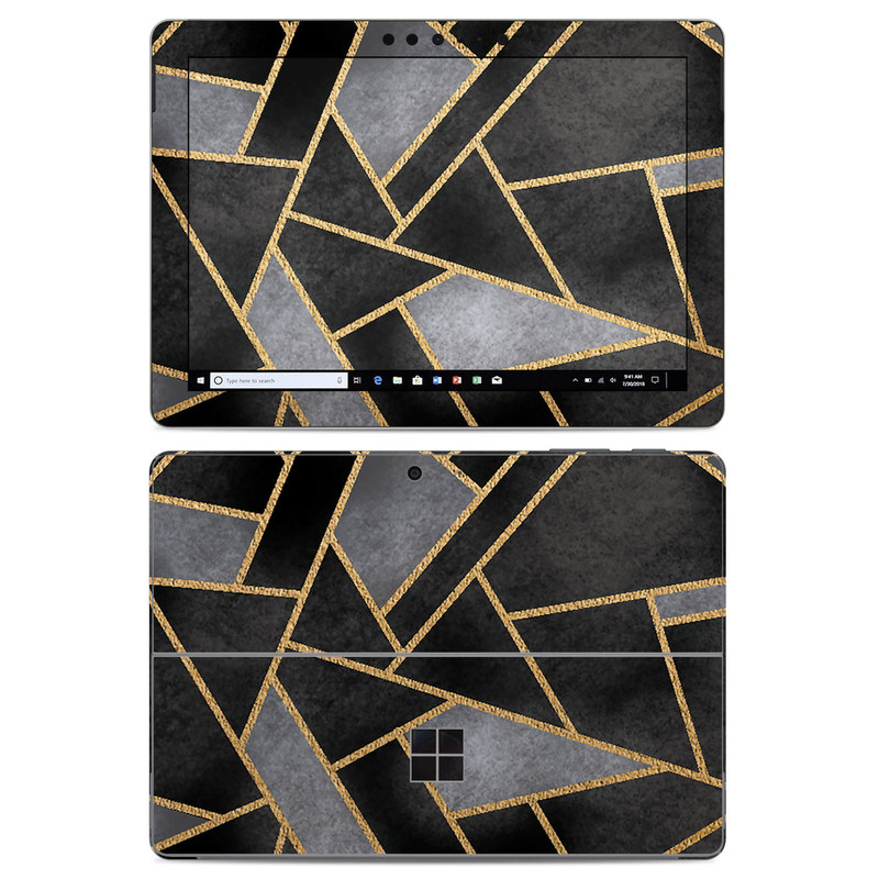 iStyles Microsoft Surface Go Skin design of Pattern, Triangle, Yellow, Line, Tile, Floor, Design, Symmetry, Architecture, Flooring, with black, gray, yellow colors, and tagged with patterns.
