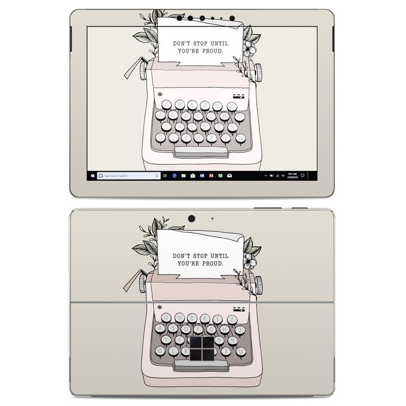 iStyles Microsoft Surface Go Skin design of Typewriter, Office equipment, Space bar, Office supplies, Illustration, with black, white, pink colors, and tagged with objects, flowers, filigree, flower, flowers, pastel, sketch.