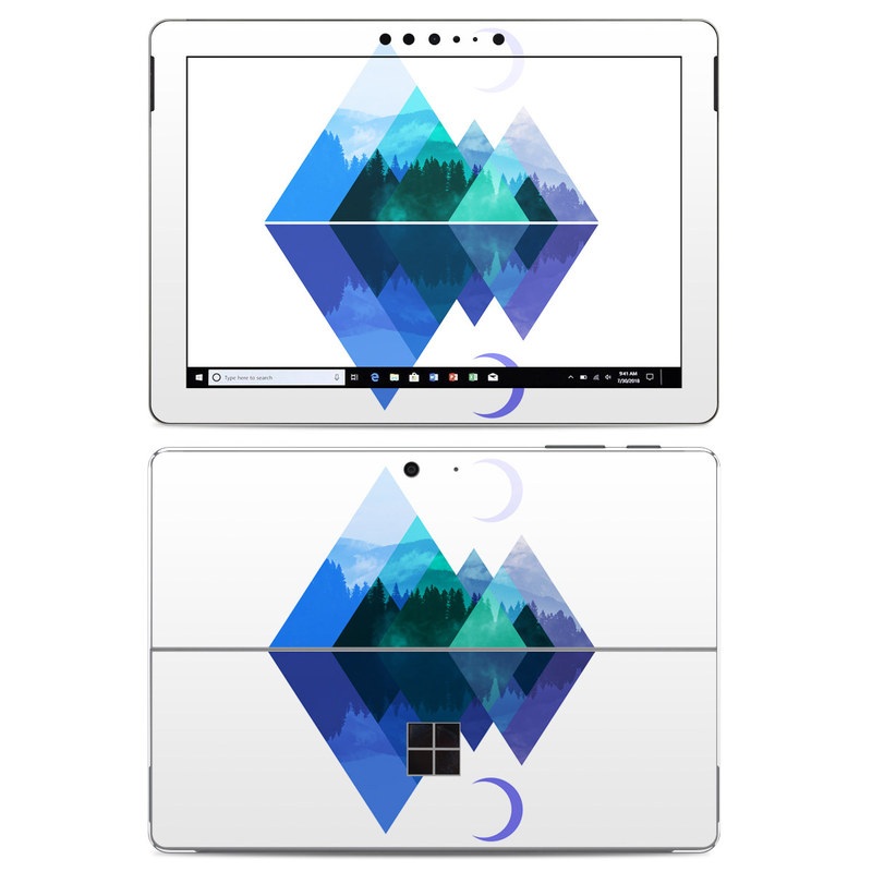 iStyles Microsoft Surface Go Skin design of Blue, Cobalt blue, Azure, Pattern, Logo, Design, Electric blue, Graphics, Illustration, Triangle, with white, blue, purple, green colors, and tagged with nature, objects, signs, earth, geometry, moon, mountains, nature, plants, trees.