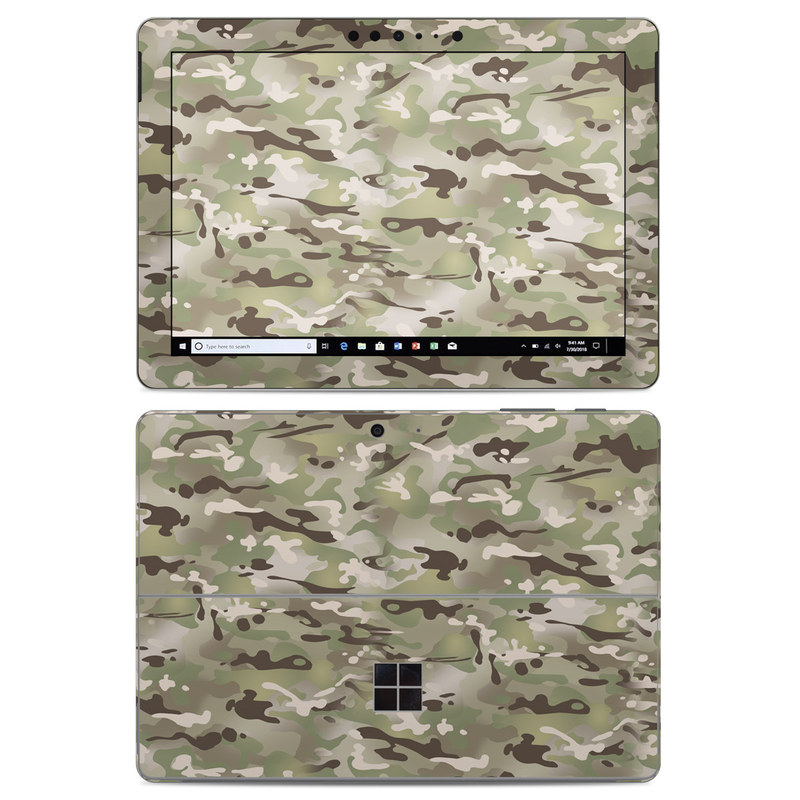 iStyles Microsoft Surface Go Skin design of Military camouflage, Camouflage, Pattern, Clothing, Uniform, Design, Military uniform, Bed sheet, with gray, green, black, red colors, and tagged with military, lookslike, patterns.
