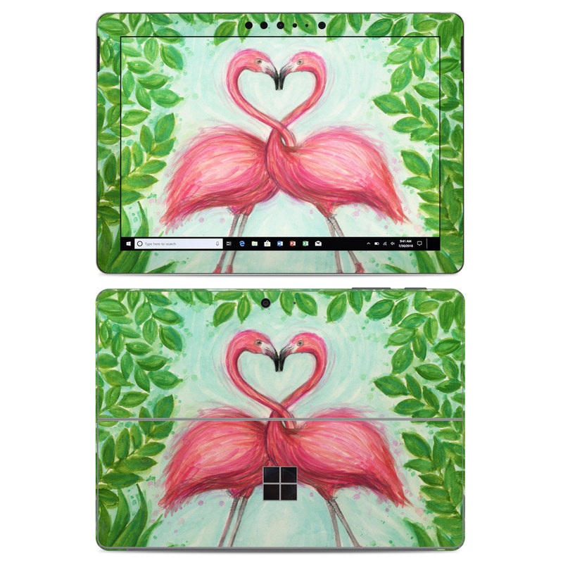 iStyles Microsoft Surface Go Skin design of Flamingo, Greater flamingo, Bird, Water bird, Pink, Illustration, Watercolor paint, Organism, Drawing, Stork, with pink, blue, green colors, and tagged with fineart, animals, hearts, nature, animals, birds, flamingo, tropical, tropics.