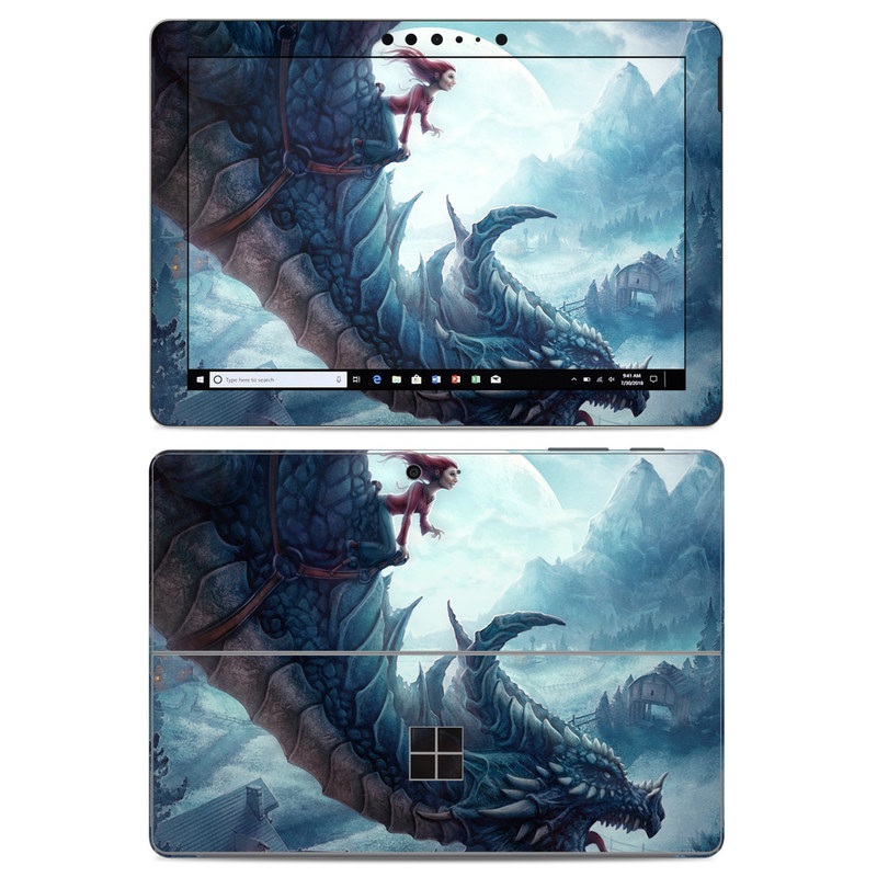 iStyles Microsoft Surface Go Skin design of Dragon, Cg artwork, Illustration, Action-adventure game, Fictional character, Mythical creature, Mythology, Fiction, Cryptid, Extinction, with blue, white, brown, green colors, and tagged with fantasy, animals, people, nature, urban, dragon, fantasy, girl, night, woman.