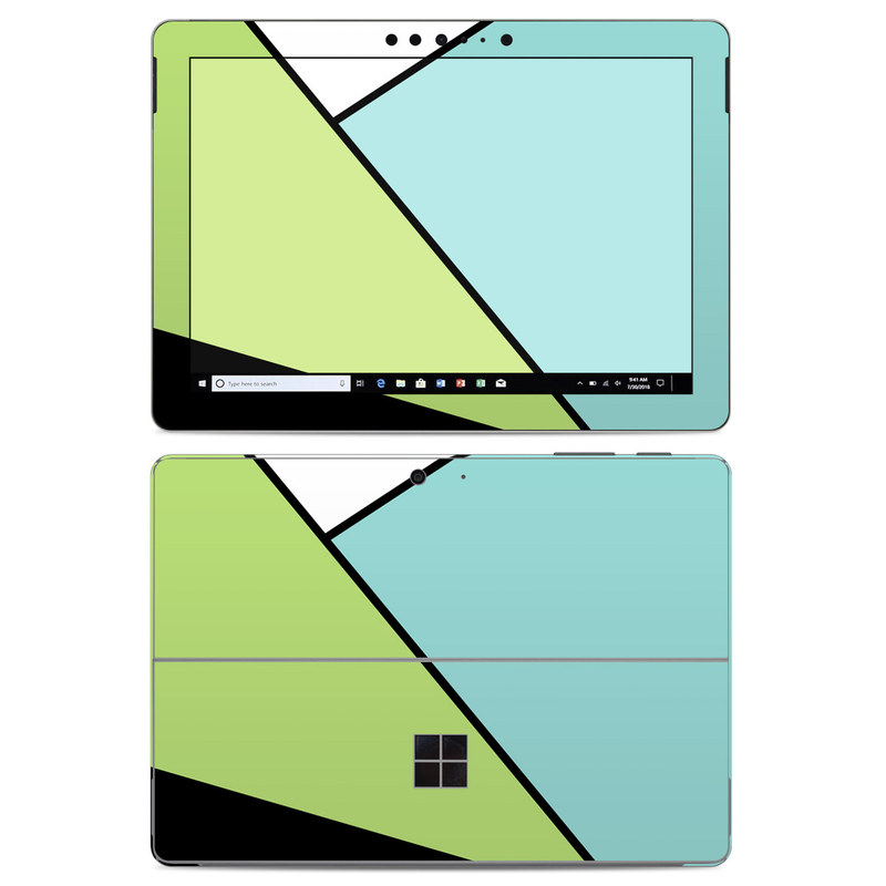 iStyles Microsoft Surface Go Skin design of Green, Line, Blue, Triangle, Design, Parallel, Pattern, Graphic design, Slope, with white, black, green, blue colors, and tagged with patterns, block, blocking, color, colorblock, geometric, shape, simple.