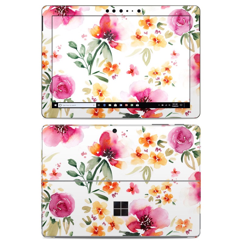 iStyles Microsoft Surface Go Skin design of Flower, Floral design, Pink, Pattern, Petal, Plant, Botany, Design, Wildflower, Clip art, with white, pink, red, orange, green colors, and tagged with flowers, patterns, florals, flowers, pattern, watercolor.