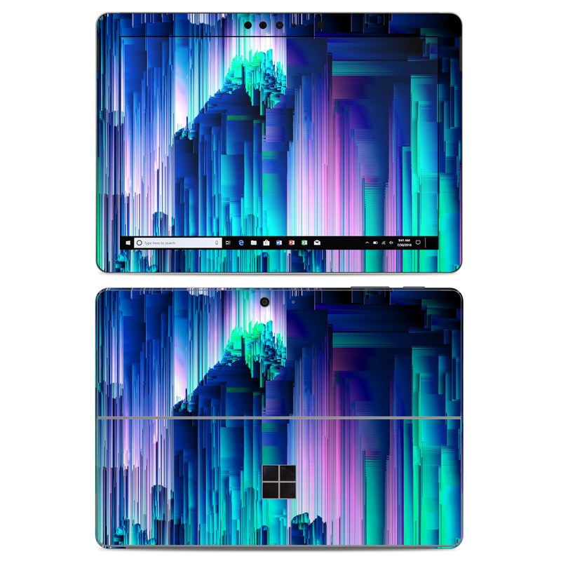 iStyles Microsoft Surface Go Skin design of Blue, Green, Light, Colorfulness, with blue, purple, pink, white colors, and tagged with abstract, space, blue, geometric, geometry, glitch, green, lines, matrix, pink, purple, space.