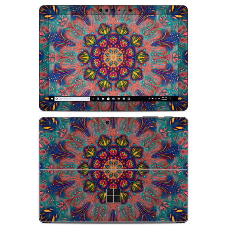 iStyles Microsoft Surface Go Skin design of Psychedelic art, Pattern, Art, Textile, Symmetry, Visual arts, Design, Fractal art, Kaleidoscope, Tapestry, with blue, yellow, red, green, pink, green colors, and tagged with patterns, flowers, abstract, abstract, blue, bright, floral, flower, green, pink, teal, yellow.