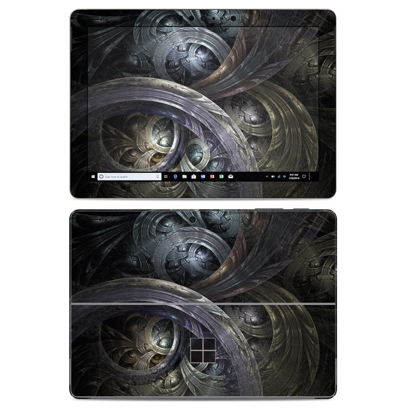 iStyles Microsoft Surface Go Skin design of Fractal art, Graphic design, Art, Cg artwork, Darkness, Circle, Pattern, Illustration, Graphics, Metal, with black, gray, blue colors, and tagged with fractals.