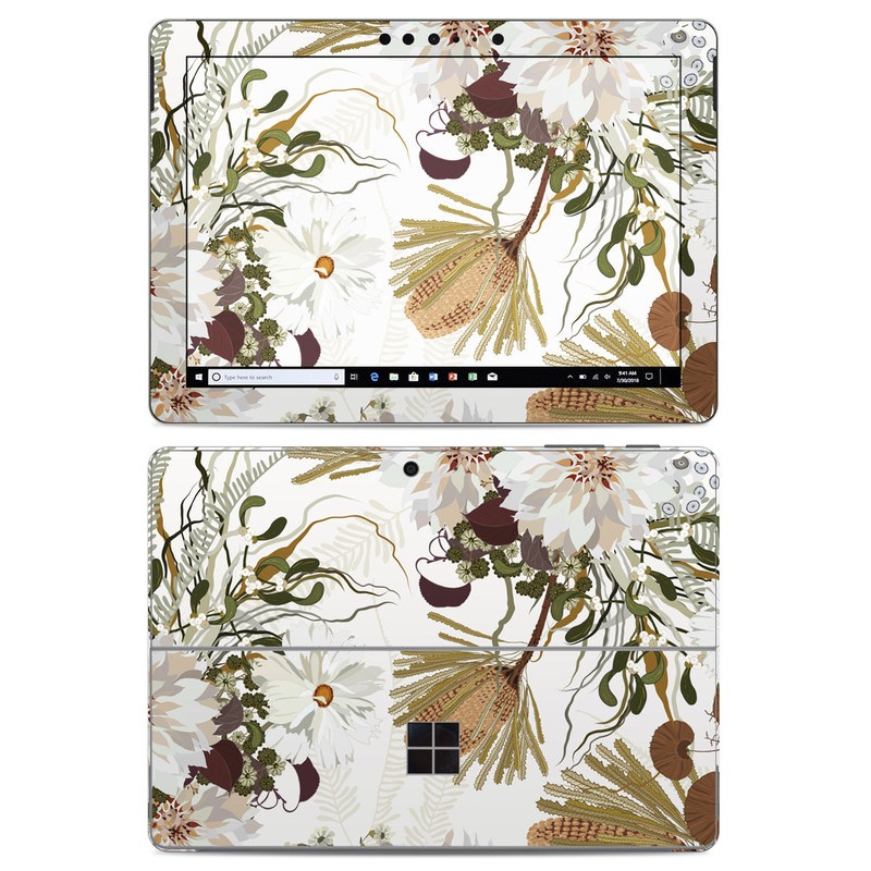 iStyles Microsoft Surface Go Skin design of Flower, Botany, Plant, Floral design, Wildflower, Pattern, Wallpaper, Textile, Petal, Butterfly, with white, brown, green, gray colors, and tagged with nature, patterns, flowers, brown, cream, filigree, floral, flower, flowers, green, leaf, leaves, nature, neutral, outdoor.