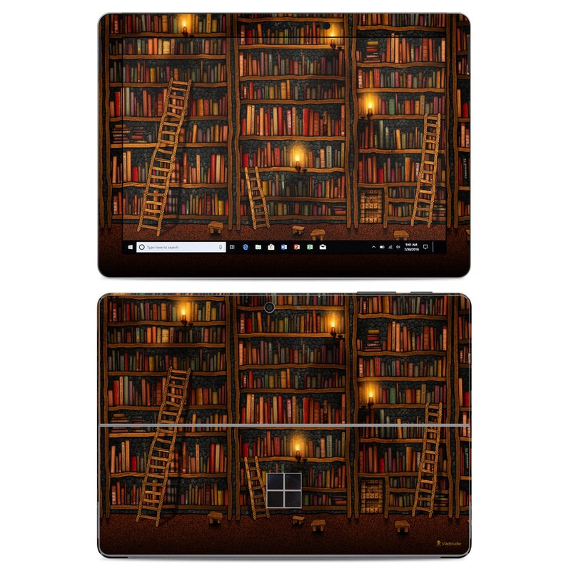 iStyles Microsoft Surface Go Skin design of Shelving, Library, Bookcase, Shelf, Furniture, Book, Building, Publication, Room, Darkness, with black, red colors, and tagged with fineart, objects.